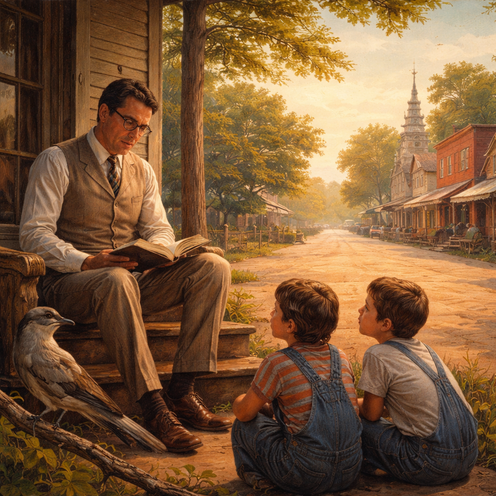 Their father, Atticus Finch, is an attorney, respected in the community. He is perfectly embodied in Gregory Peck in the movie version. In typical small-town tolerance, he explains that nobody expects a certain family to abide by the rules. Their kids show up the first day of school and never attend after that. The school just marks them down as present. Atticus explains that, with a father who lives on home-brewed liquor and whatever game he can kill (in season or out), everybody just lets them be. In the calm wisdom of Atticus, the novel teaches moral humility. He never looks for a fight, but does not refuse one when it comes his way. In a small town, you mainly avoid and, whenever possible, defuse conflict. But,.when he is asked to defend a young black man accused of assault, he takes the case. And sticks with it, even in the face of an angry mob.